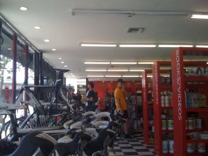 Triathlon LABサンタモニカ店はレドンドビーチ店よりも店舗としては少し大きく、自転車もアパレルも同じ店内に並んでいます。