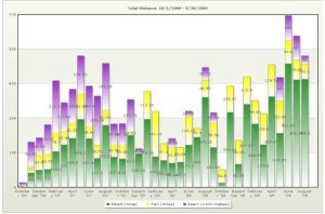 上のグラフは月別実績(距離)です。(紫色のSwimはX100mとなっています。)