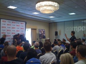 Chris Camichaelは私と同じ年のおっさんさんですが、オリンピックや欧州のBigレース等に出場したアメリカ自転車創世記の草分け的存在で、自転車業界での長年の功績が認められ、生涯功労賞も受賞した方です。彼の話は当時のレースの様子から始まり、彼がコーチに転向してから、あのLance Armstrongのコーチを担当したときの話など、、、、、そして、本題である”時間の無いサイクリストのトレーニングプログラムの秘訣”という話題になったところで時間切れ。この後は彼が書いた本を買ってねということでした。