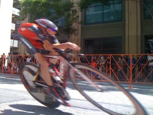 さて本日のTT Stageを制したTeam HTC ColumbiaのTony Martinは41分41秒で33Kmを走り切った訳ですので、時速48Km平均です、LA Down Town内を何度も何度も右折、左折をさせらるコースで、路面の舗装も悪い条件ですので、プロ選手の速さがどれぐらいのものか、私の手持ちのデジカメやiphoneでは、被写体を押さえることもできず、写真撮影は困難を極めます、下の写真で、その速さをご理解頂けるものと思います。