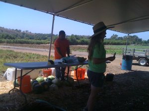最初にサンプルで頂く無農薬野菜の種類がいつもよりも少なかったかとも思いましたが、お土産に大きなスイカを一玉もらいますので、現地での試食分も含めると$13は納得の価格です。