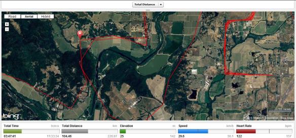 また、私の心拍数や走行速度など全く興味無しと言う方は、画面右側のPLAYERを選び、CDプレーヤー(表現が古いですが、、、)の▲(再生ボタン)を押すと、赤い矢印がシュミレーションしながら動き出します。その際に下の様にAerialを選択し、拡大するとその地域の様子が航空写真(Google)で表示されますので、ブドウ畑なのか、海岸沿いなのか、ハッキリわかりますので、コースのお勧め度をチェックすることもできます。GPSの機能は極めて正確で、川であれば右岸が左岸のどちらを走ったのかも表示されますし、自宅前から出発し自宅に戻った場合のデーターを開示してしまうと何処に住んでいるか(どんな家に住んでいるか)を第3者に開示してしまうことになります。(ワザと裏庭にプールがあるような他人の豪邸の前から走りだすというトリックもできますが、、、)