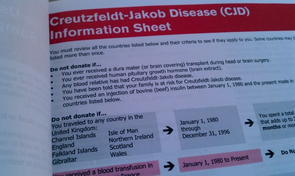 日本、米国で献血できないことに関して、私の今の生活には全く支障がないのですが、例えば、身近な人にも輸血できないのかと思ったり、英国では輸血は全て輸入に頼っているのかと、要らぬ心配をしたり、、、、、恐るべき狂牛病、、、、、、、