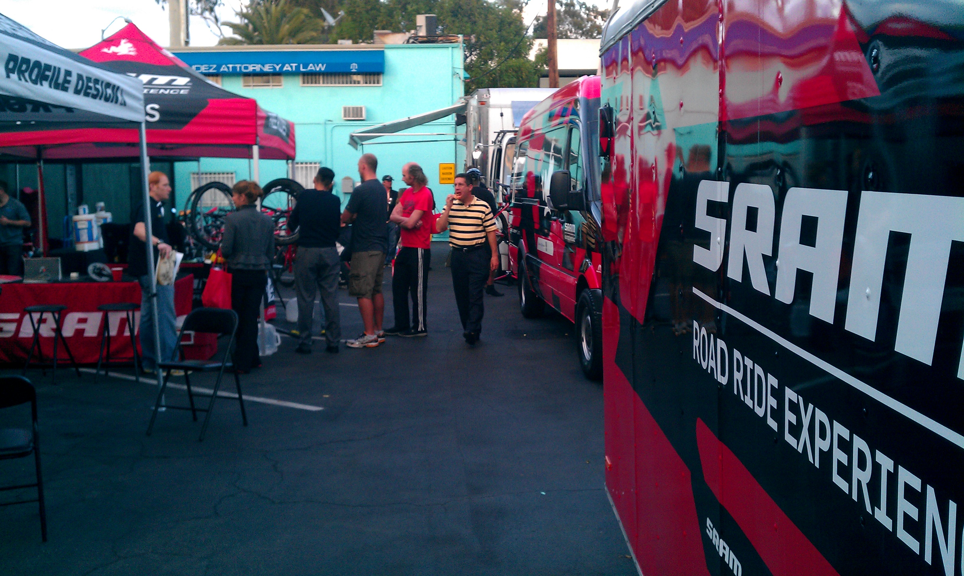 ところ狭しと各社が商品を出展、各社の営業担当者が説明するというミニExpo状態で、加えてビザや飲み物、外では、Specialized がTest Ride用の自転車を10台ほどデモトラックごと出展と豪華な顧客サービスイベントです。