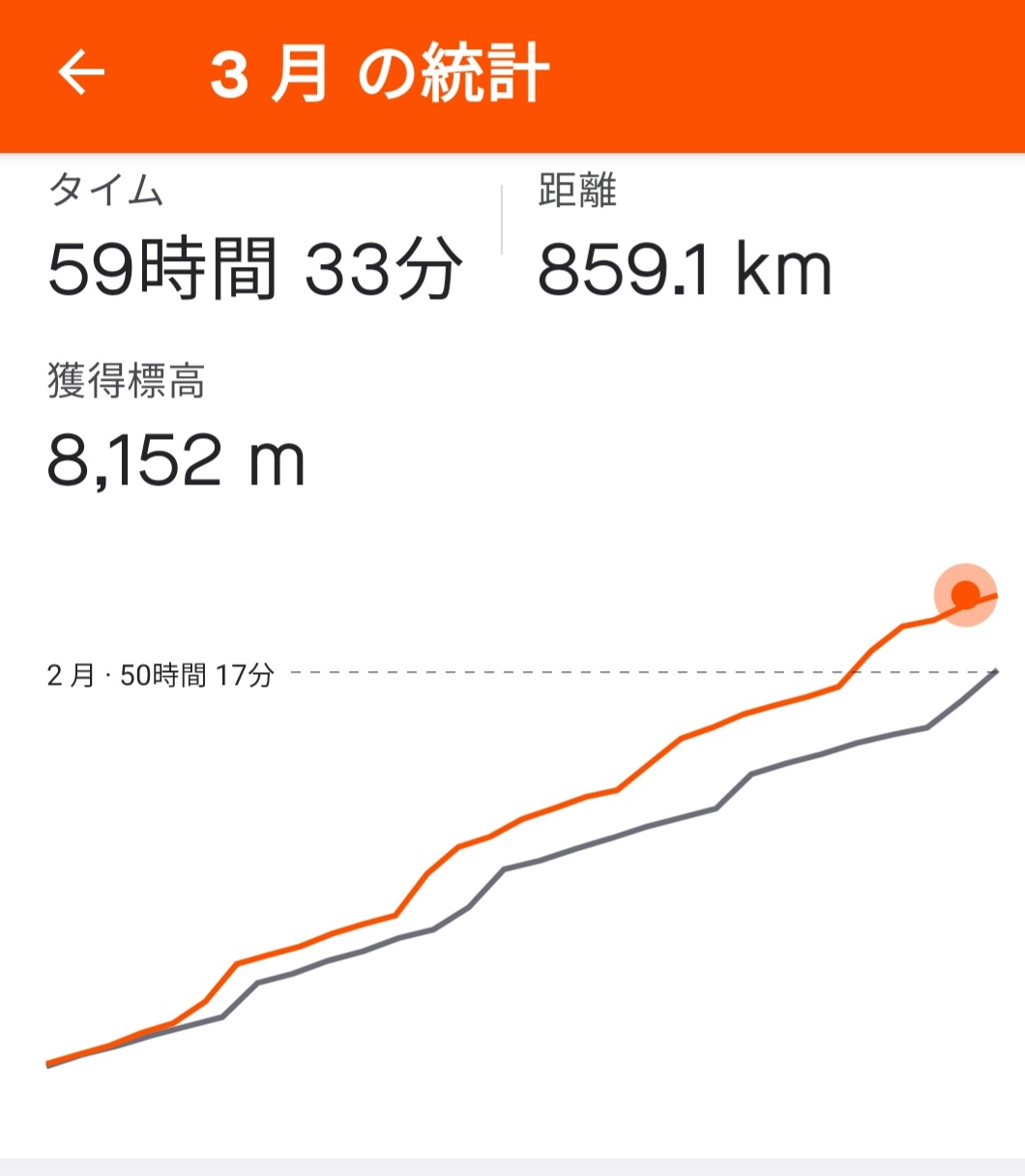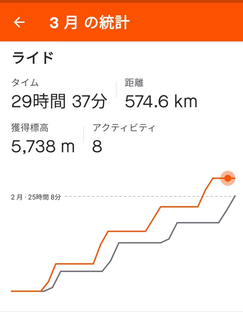 レース参戦やロングディスタンスのイベント参加の予定がある訳でもありませんので、これ以上の時間や距離を伸ばす必要はありませんが、4月も3月同様、ジョギングやサイクリングに最適な季節だと思いますので、健康推進、体力向上を目的に楽しませて頂きます。