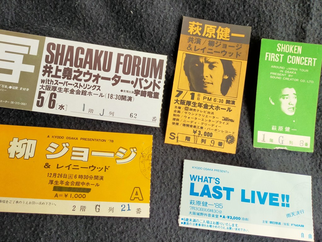 左下のチケットは今から43年前、1978年12月26日、柳ジョージ&Rainywoodのコンサート。大阪厚生年金会館の中ホール2階としても1000円は破格。ファーストアルバム発売後、人気に火がついた最初のコンサートで、会場はほぼ一杯、当時高校2年生の私に大きなインパクトを与えました。YouTubeで見つけた下のビデオは、それから1年後の1979年、年越しコンサートの映像ですが、ここまで盛り上がったという記憶はなく、初めて生で聴く柳ジョージの渋い声に酔いしれたいという、もう少し大人の層だったと思います。