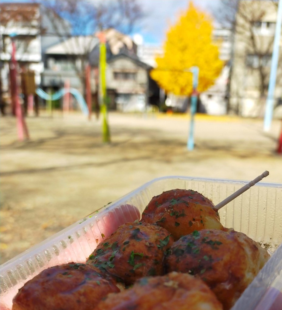帰り道、おはあちゃんがやっているたこ焼屋さんがあったので、思わず公園で買い食いです。