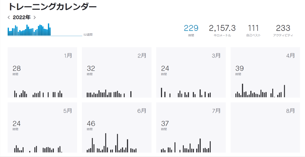 先月よりも時間は短くなりましたが、後半は膝の不調も一息ついて、それなりに走れるようになりました。