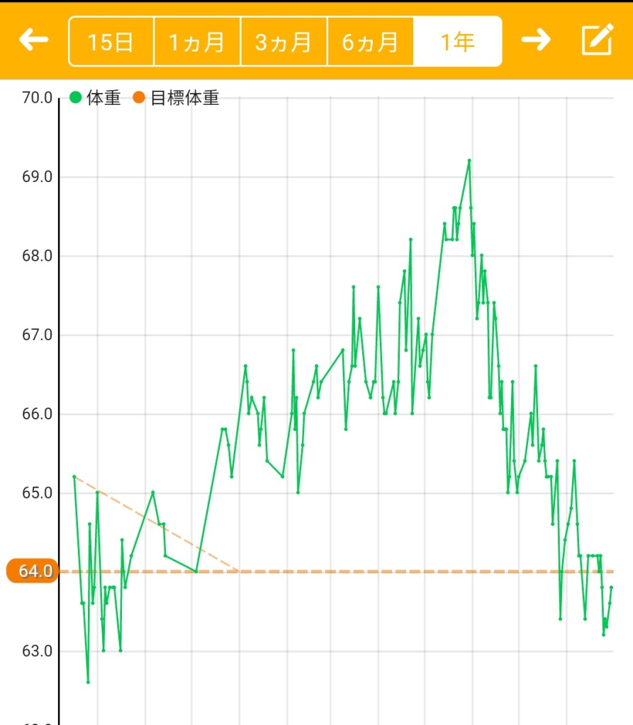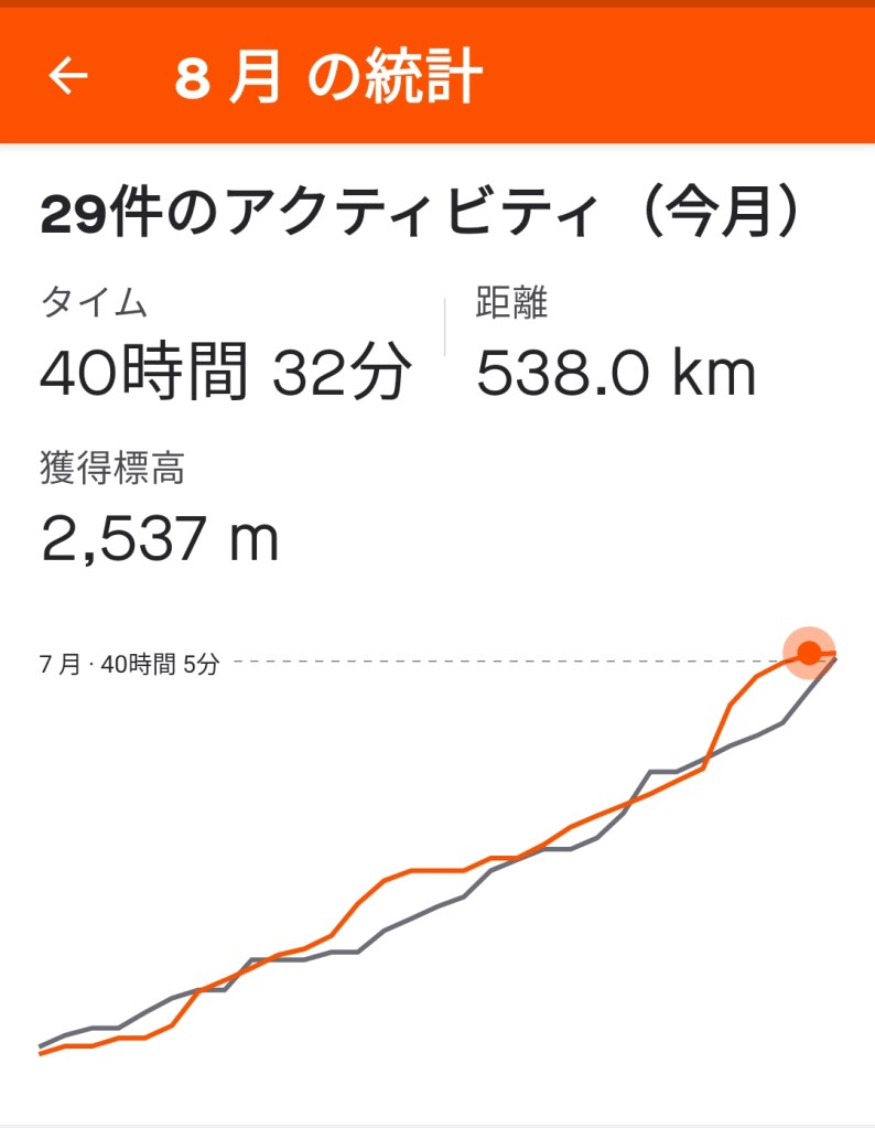 酷暑の8月、体感気温が体温を上回った日や熱中症警戒アラートが発令された日など、日中の運動は控えましょうという暑い毎日でした。体重も64Kg前後となったのも、体内の水分が汗で減少した為かもしれません。