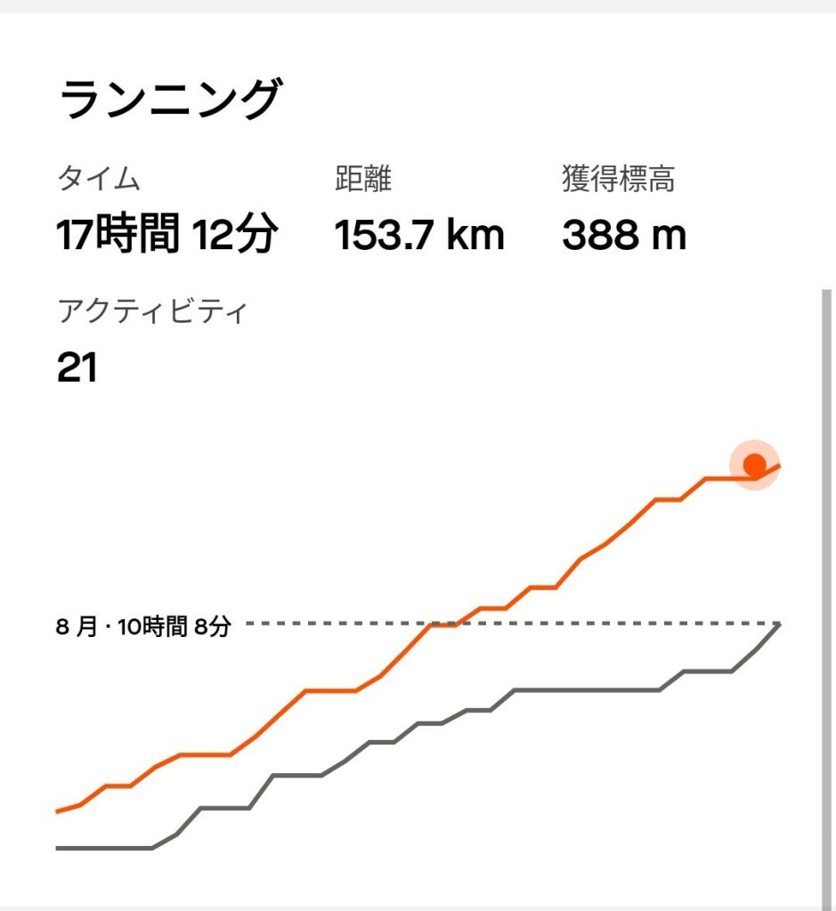 ランニング 17時間12分 153.7Km 獲得標高 388m (8時間59分 78.1Km 獲得標高 207m )