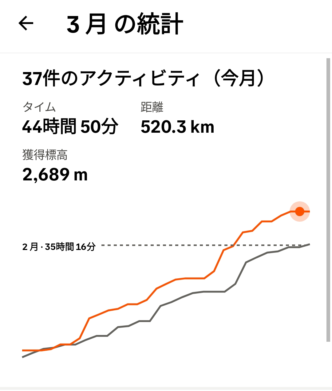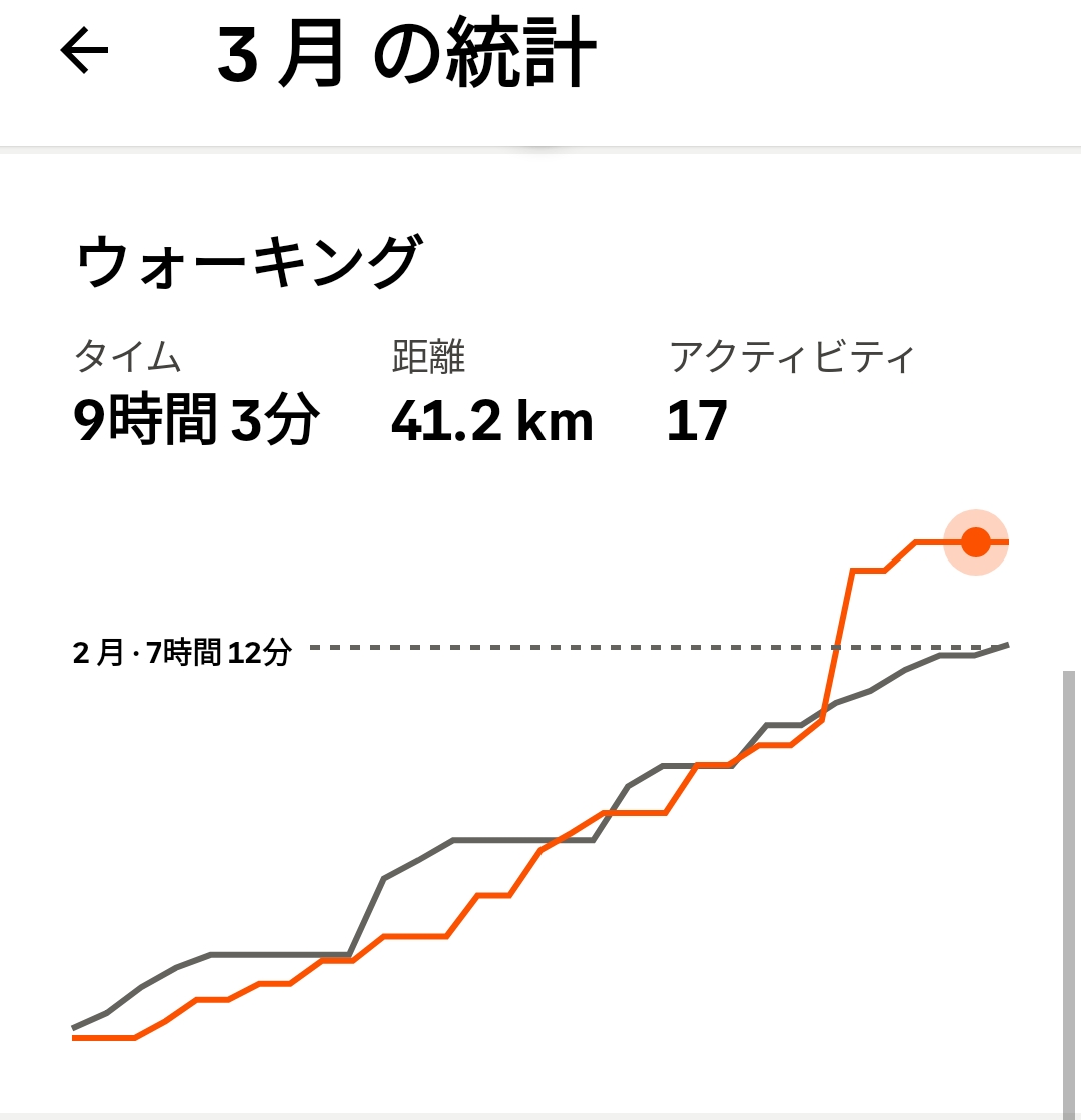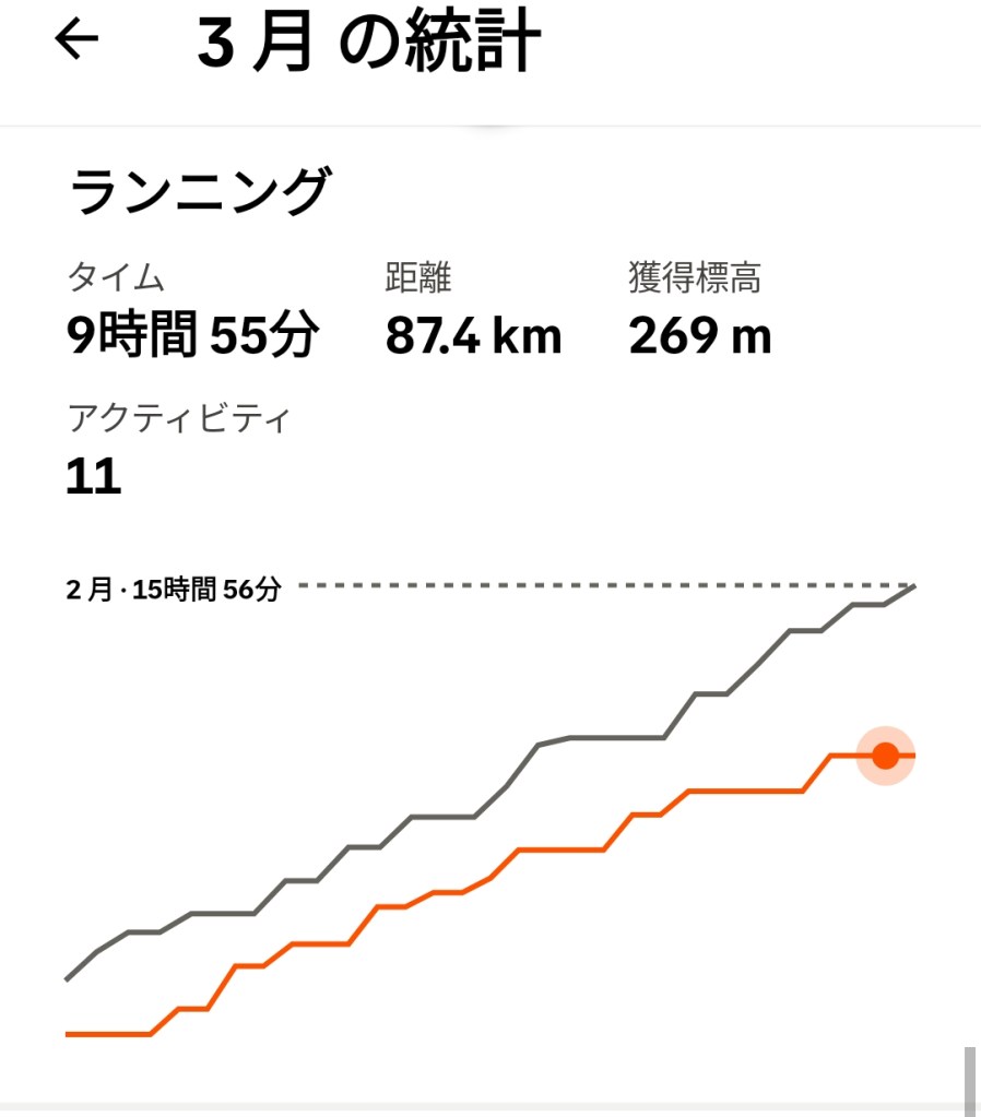 2月の35時間と比べると、10時間増ですので、そこそこ時間的には積みましたが、ランニングは先月よりも6時間減の約10時間と大幅未達。裏返すとウォーキングやポタリング等の低負荷のメニューは増加したものの、ガッツリ心拍を上げるような高負荷のメニューは減。また一回の運動時間が短いこともあり有酸素運動の効果がないままに終わりという感じでしょう、、、