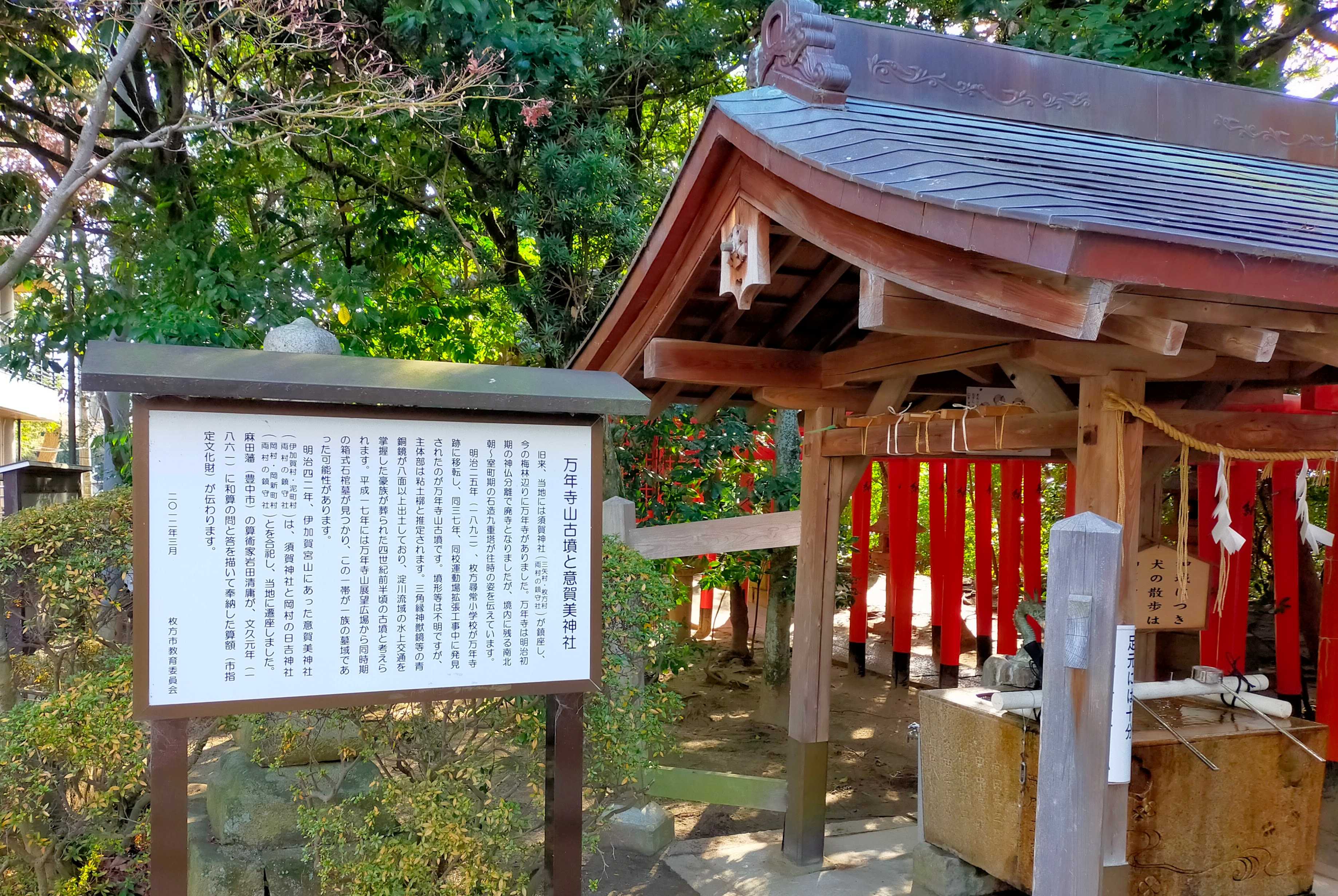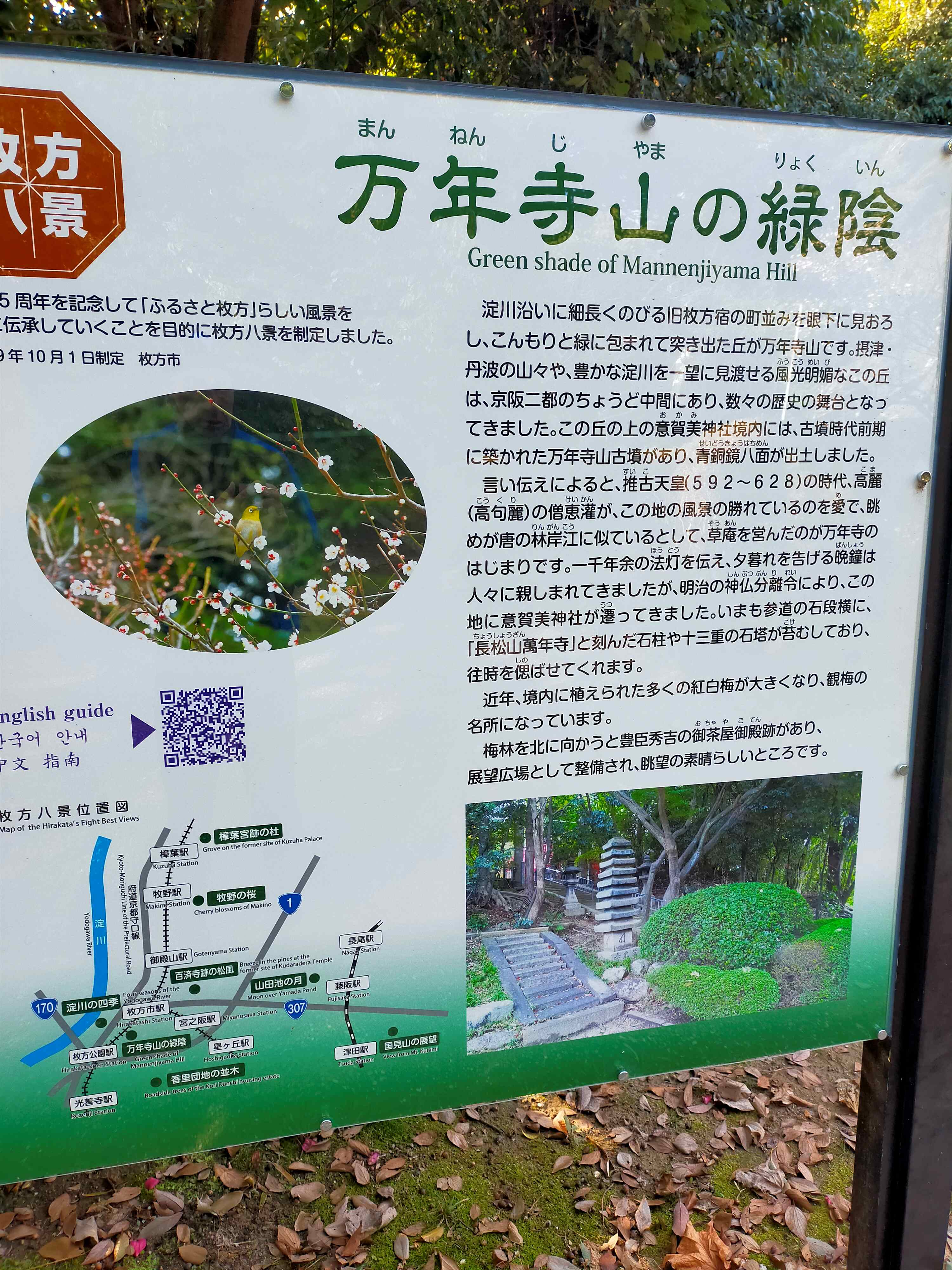 淀川沿いに細長くのびる旧枚方宿の町並みを眼下に見おろし、こんもりと突き出た丘が万年寺山です。摂津・丹波の山々や、豊かな淀川を一望に見渡せる風光明媚なこの丘は、京阪二都のちょうど中間にあり、数々の歴史の舞台となってきました。この丘の上にある意賀美(おかみ)神社の境内には、古墳時代前期の万年寺山古墳があり、青銅鏡が八面出土しました。~枚方市ホーム 枚方八景万年寺山の緑陰から引用